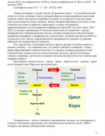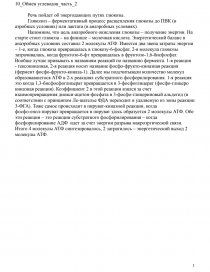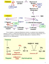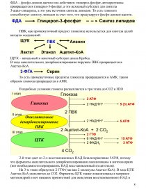Напомним, что цель анаэробного окисления глюкозы – получение энергии. На старте стоит глюкоза – на финише – молочная кислота. Энергетический баланс в анаэробных условиях составил 2 молекулы АТФ. Имеется два звена затраты энергии – 1-е, когда глюкоза превращалась в глюкозу-6-фосфат, 2-я молекула глюкозы затрачивалась, когда фруктозо-6-фт превращалась в фруктозо-1,6-бисфосфат. Вообще лучше привыкать к названиям реакций по названию фермента. 1-я реакция - гексокиназная, 2-я реакция носит название фосфо-фрукто-киназная реакция (фермент фосфо-фрукто-киназа-1). Далее мы подсчитывали количество молекул образовавшегося АТФ в 2-х реакциях субстратного фосфорилирования. 1-я реакция это когда 1,3-бисфосфоглицерат превращается в 3-фосфоглицерат (фосфо-глицеро киназная реакция). Коэффициент 2 в этой реакции взялся за счет взаимопревращения диокси-ацетон-фосфата в 3-фосфо-глицериновый альдегид (в соответствии с принципом Ле-шателье ФДА переходит в удаляемую из зоны реакции 3-ФГА). Тоже самое происходит в пируват-киназной реакции, когда фосфо-енол-пируват превращается в пируват здесь образуется 2 молекулы АТФ. Обе эти реакции – это реакции субстратного фосфорилирования – когда фосфорилирование АДФ идет за счет энергии разрыва макроэргической связи. Итого 4 молекулы АТФ синтезировалось, 2 затратилось – энергетический выход 2 молекулы АТФ.