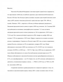 Население Российской Федерации в настоящее время стремительно сокращается, что представляет собой одну из наиболее серьезных угроз национальной безопасности России в XXI веке. Все большую тревогу вызывает ситуация, при которой поколение детей лишь на 60% замечает поколение родителей, страна ежегодно теряет 700—800 тыс. человек. Начиная с 1992 г. смертность в России устойчиво превышает рождаемость. Ожидаемая продолжительность жизни в стране в 2020 году снизилась. За 12 месяцев 2020 года наблюдаются негативные демографические тенденции. 71,5 года составила ожидаемая продолжительность жизни (снижение на 1,84 по сравнению с 2019 годом — 73,34 года). Рост показателей общей смертности в РФ с января по декабрь 2020 года составил 17,9% по сравнению с 2019 годом. Прирост смертности составили летальные исходы от коронавируса. Смертность в России в марте 2021 года, согласно оперативным данным Росстата, снизилась на 14% по сравнению с январем 2021 года. Общая заболеваемость населения в 2020 году снизилась на 5,3%. В 2019 году этот показатель составлял 164 899,4, а в 2020 году — 156173,3. При этом в 2020 году по сравнению с 2019 годом общая заболеваемость по классу болезней органов дыхания выросла на 2,7%. Общая же заболеваемость населения болезнями системы кровообращения снизилась на 6,7%, а по новообразованиям — на 5,3%. Кроме того, на 2,8% снизилась заболеваемость с диагнозом, установленным впервые в жизни, — с 78024,3 в 2019 году до 75841,4 на 100 тыс. населения в 2020 году.