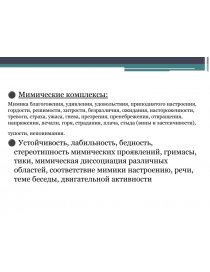 Устойчивость, лабильность, бедность, стереотипность мимических проявлений, гримасы, тики, мимическая диссоциация различных