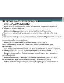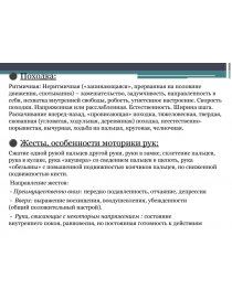 гебефренич., эпилептич., маниакальное, алк. и т. п.); умеренный темп движений; замедленный темп, вялые движения, двигательная заторможенность, застывание в вычурных позах, ступор (при кататоническом выявляются мутизм, симптомы капюшона, Бумке, воздушной подушки, хоботка, каталепсия).