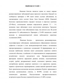 Выводы к главе I ……………………………………………………………... Библиография…………………………………………………………………. Список сокращений АД – артериальное давление СОЭ – скорость оседания эритроцитов ФГДС – фиброгастродуоденоскопия ЧДД – число дыхательных движений ЧСС – число сердечных сокращений ЭГДС – эзофагогастродуоденоскопия ЯБ – язвенная болезнь H.pylori – Helicobacter pylori ВВЕДЕНИЕ Актуальность Язвенная болезнь представляет серьёзную медико – социальную проблему, что обусловлено его широким распространением, поражением любых возрастных, профессиональных групп населения, наличием тяжёлых осложнений, трудностью лечения и способностью наносить огромный социально - экономический ущерб. Язвенная болезнь желудка и двенадцатиперстной кишки – одно из наиболее распространённых заболеваний верхних отделов желудочно – кишечного тракта и было известно врачам с глубокой древности. Этим заболеванием страдают около 10% населения земного шара. Сегодня на протяжении последних десятилетий остаётся одной из частых причин по обращаемости населения в амбулаторно- поликлинические учреждения. В развитых странах встречается у 3-5 % взрослого населения (2020). В России в последние годы доля пациентов с впервые выявленной язвенной болезнью возросла с 18 до 26%. Городское население страдает этим заболеванием чаще, чем жители села, преимущественно болеют молодые и взрослые мужчины 25-40 лет. Женщины чаще заболевают после наступления менопаузы. У мужчин дуоденальные язвы являются наиболее распространёнными, чем язвы желудка, у женщин наоборот. А у детей и подростков язвенную болезнь желудка диагностируют крайне редко. Примерно у 35-40% пациентов с язвой желудка наблюдаются серьёзные осложнения (2020). Язвенная болезнь – хроническое рецидивирующее заболевание, характеризующее образованием язвы в стенке слизистой оболочки желудка или луковице двенадцатиперстной кишки, протекающее с чередованием периодов обострения и ремиссии и с возможным развитием осложнений. Активное изменение социально – экономической структуры современного общества, проявляющееся стремительной урбанизацией, нарастанием темпа жизни и негативного стрессорного (Самсонов В.А. Язвенная болезнь\В.А. Самсонов. - М.: Карелия, 2019. -260с) влияния окружающей среды, резким ухудшением питания, качеством воды, состоянием чистоты атмосферного воздуха прямо сказывается на состоянии здоровья населения и общую картину заболеваемости в стране. Несмотря на успехи в диагностике, лечении язвенной болезни, это заболевание продолжает поражать всё более молодое население, не обнаруживая тенденций к стабилизации или снижению показателей заболеваемости. В качестве предрасполагающих факторов язвенной болезни рассматриваются всевозможные нарушения питания, злоупотребление употребление острых продуктов, алкоголя, крепкого кофе и пристрастие к никотину, инфицирование желудка хелиикобактериями и кандидами, бесконтрольный приём лекарственных средств, влияющих на слизистую оболочку желудочно – кишечного тракта. Считается, что нарушение режима сна (хроническое недосыпание), сочетание негативного напряжения и большой ответственности, присущи различным профессиям: лётчикам, авиадиспетчерам, хирургам, реаниматологам, что может спровоцировать развитие язвенной болезни. Поэтому очень важно предп