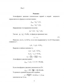 Две запаянные с одного конца трубки, заполненные жидкостями с удельными весами γ1 = 11 кН/м3 и γ2 = 10 кН/м3, опрокинуты в открытые сосуды с теми же жидкостями (рис.2). В запаянных трубках жидкость поднялась на высоту h1 и h2 соответственно. Принимая давление паров рассматриваемых жидкостей равным нулю, определить атмосферное давление, если разность высот столбов этих жидкостей составляет 0,9 м. Как изменится разность уровней жидкостей в трубках, если атмосферное давление повысится на 2%?