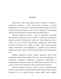 Актуальность темы обусловлена большим интересом к проблеме в современном обществе, а также недостаточной степенью ее научной разработанности. Действительно, трудно недооценивать важность института принципа разделения властей сегодня, когда он закреплен в Конституциях практически всех развитых демократических государств планеты.