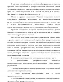 Объект и предмет исследования. Объектом исследования являются общественные отношения, возникающие при конституционно-правовом регулировании свободы предпринимательства, реализации конституционных норм о свободе предпринимательства, осуществлении судебной защиты конституционных прав и свобод субъектов предпринимательской деятельности.