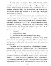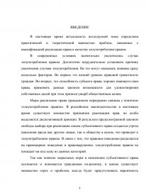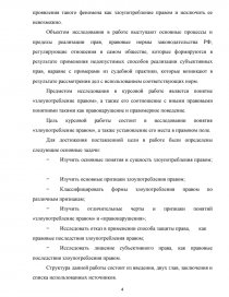 Объектом исследования в работе выступают основные процессы и пределы реализации прав, правовые нормы законодательства РФ, регулирующие отношения в самом обществе, которые формируются в результате применения недопустимых способов реализации субъективных прав, наравне с примерами из судебной практики, которые возникают в результате рассмотрения дел с использованием соответствующих норм.