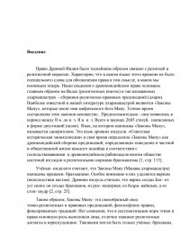 Право Древней Индии было теснейшим образом связано с религией и религиозной моралью. Характерно, что в самом языке этого времени не было специального слова для обозначения права в том смысле, в каком мы понимаем теперь. Наши сведения о древнеиндийском праве основаны главным образом на Ведах (религиозных книгах) и так называемых дхармашастрах – сборники религиозно-правовых предписаний (дхарм). Наиболее известной в нашей литературе дхармашастрой являются «Законы Ману», которые носят имя мифического бога Ману. Точное время составления этих законов неизвестно. Предположительно - они появились в период между ІІ в. до н. э. ІІ в. н. э. Всего в законах 2685 статей, написанных в форме двустиший (шлок). Язык, на котором написаны «Законы Ману», называется санкритским. Это язык древних индусов. «Советская историческая энциклопедия» в своё время определяла «Законы Ману» как древнеиндийский сборник предписаний, определяющих поведение в частной и общественной жизни каждого индийца в соответствии с господствовавшими в древнеиндийском рабовладельческом обществе системой взглядов и религиозными нормами брахманизма [1, стр. 113].