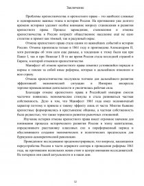 Реферат состоит из введения, основной части, заключения и библиографического списка. Во введении представлена актуальность, цель и задачи исследования. В первой главе «Становление и развитие крепостничества в России» рассмотрены основные предпосылки развития крепостного права, исторические предпосылки и главные этапы становления крепостного права в России. Вторая глава «Отмена крепостного права» посвящена, в том числе основным этапам процесса отмены крепостного права в России. Также были рассмотрены предпосылки отмены крепостничества. В главе три «Последствия отмены крепостного права в России» рассмотрены последствия отмены крепостного права и дальнейшее влияние крепостничества на историю России в целом. В заключении сделаны выводы о проделанной работе.
