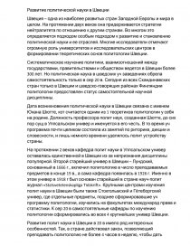Швеция – одна из наиболее развитых стран Западной Европы и мира в целом. На протяжении двух веков она придерживается стратегии нейтралитета по отношению к другим странам. Во многом это определяется подходом особым подходом к развитию и становлению политической науки и ее отраслей. Многие исследователи отмечают огромную роль университетов и исследовательских центров в формировании теоретических основ политологии Швеции.
