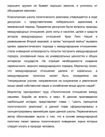 Моргентау принадлежит труд «Политические отношения между нациями. Борьба за власть и мир». В данном произведении наибольший интерес представляет глава – “шесть принципов политического реализма”, в данной главе сформулированы и сконцентрированы важнейшие идеи данной школы. Первоначально автор обосновывает мысль о том, что в основе международной политики лежат законы политического поведения, корни которых следует искать в природе человека.