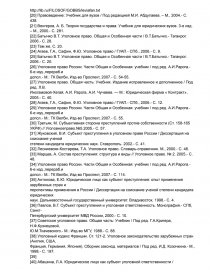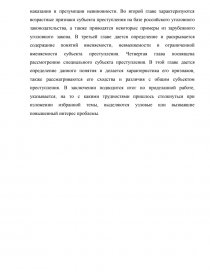 Структура работы. Данное исследование состоит из:введения, четырех глав, заключения и списка используемых источников и литературы. В первой главе производится анализ понятия субъект преступления в сочетании с ключевыми категориями уголовного права: преступление, состав преступления и уголовная ответственность. В этой главе раскрывается сущность и содержание этих понятий, а также кратко затрагиваются понятия наказания и презумпции невиновности. Во второй главе характеризуются возрастные признаки субъекта преступления на базе российского уголовного законодательства, а также приводятся некоторые примеры из зарубежного уголовного закона. В третьей главе дается определение и раскрывается содержание понятий вменяемости, невменяемости и ограниченной вменяемости субъекта преступления. Четвертая глава посвящена рассмотрению специального субъекта преступления. В этой главе дается определение данного понятия и делается характеристика его признаков, также рассматриваются его сходства и различия с общим субъектом преступления. В заключении подводится итог по проделанной работе, указывается, на то с какими трудностями пришлось столкнуться при изложении избранной темы, выделяются узловые или вызвавшие повышенный интерес проблемы.