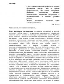 Тема дипломного исследования оказывается актуальной и важной, поскольку судебная власть в современных высокоразвитых государствах занимает ведущие позиции в структуре государственной власти. Судебная власть оказывает влияние на политические инстанции как формально, так и фактически. Судьи, являясь членами судебной власти, обладают особыми властными полномочиями и принимают ключевые решения в рамках данной ветви власти. В Казахстане суды и судьи также имеют высокую значимость, и исследование данной темы позволит более глубоко понять и проанализировать роль и влияние судейского корпуса в политико-государственных процессах. Изучение этой темы позволит также рассмотреть организацию и функционирование судебной системы в Казахстане, а также выявить особенности судейской деятельности и независимости судов. Исследование данной темы может помочь раскрыть важность и роль судебной власти в укреплении демократических принципов и защите прав и свобод граждан. Кроме того, оно может сосредоточиться на вопросах прозрачности, ответственности и эффективности судебной системы, а также предложить рекомендации и реформы для ее улучшения. Проблема обеспечения эффективной судебной власти представляет собой важную экономическую и политическую задачу, а также имеет прямое влияние на авторитет и уважение страны со стороны как внутренних, так и иностранных граждан. Роль и значимость судейского корпуса в Казахстане являются основополагающими для правового развития и формирования гражданского общества в стране. От независимости и объективности судей зависит эффективность судебной системы и защита прав граждан и их объединений. Судьи являются ключевыми субъектами судебной системы и их независимость и профессионализм имеют огромное значение для обеспечения правосудия и справедливости в Казахстане. Критерии эффективности судебной власти включают обеспечение независимости и объективности судей, соблюдение прав человека, доступность и скорость судебного процесса, а также прозрачность и открытость судебной системы. Эффективная судебная власть имеет принципиальное значение для создания законопослушного общества, укрепления правового государства и уважения к праву. Она способствует установлению доверия граждан к системе правосудия, а также привлечению инвестиций и развитию экономики. Поэтому улучшение судебной системы и обеспечение независимости и объективности судей являются приоритетными задачами для Казахстана.