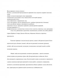 Правовой статус – это совокупность прав, свобод, обязанностей и законных интересов личности, признаваемых и гарантируемых государством В базе законного статуса лежит фактический социальный статус, т.е. реальное положение человека в данной системе общественных отношений. Право только фиксирует это положение, вводит его в законодательные рамки. Социальный и правовой статусы соотносятся как содержание и форма.