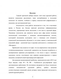 Актуальность темы работы заключается в том, что в настоящее время, в Россию все больше приходят различные информационные технологии, упрощающие жизнь населению, в том числе в трудовой сфере. Указанные технологии уже являются частью всех сфер жизни человека: политической (голосование с помощью автоматизированных систем), культурной (посещение культурных мест с помощью сети интернет), социальной (дистанционное обучение) и, что самое главное, в экономической (трудовой) сфере – удаленный труд и трудовая деятельность с помощью сети «Интернет».