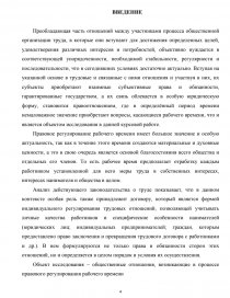 Преобладающая часть отношений между участниками процесса общественной организации труда, в которые они вступают для достижения определенных целей, удовлетворения различных интересов и потребностей, объективно нуждается в соответствующей упорядоченности, необходимой стабильности, регулярности и последовательности, что в сегодняшних условиях достаточно актуально. Вступая на указанной основе в трудовые и связанные с ними отношения и участвуя в них, их субъекты приобретают взаимные субъективные права и обязанности, гарантированные государством, а их связь облекается в особую юридическую форму, становится правоотношением, где в определённый период времени немаловажное значение приобретают вопросы, касающиеся рабочего времени, что и является объектом исследования в данной курсовой работе.