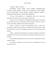 Chapter 1 proves the expediency of distinguishing the phenomenon of youth crime for study within the science of criminology, defines the scope of youth age, reveals the features of the offender, identifies the main trends of young crime.