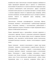 В процессе взаимодействия человека с окружающей средой возникают различные общественные отношения, которые принято классифицировать исходя из сложившихся форм такого взаимодействия. Исторически первой формой взаимодействия человека с природой является использование природных ресурсов, в процессе которого истощаются почва и полезные ископаемые, ухудшается качество воды, изменяется биота (биологическая часть природы) и т.д. Изменения, произошедшие в результате использования природных ресурсов, должны быть по возможности восстановлены, а также должны быть приняты меры по охране окружающей среды и обеспечению экологической безопасности общества.