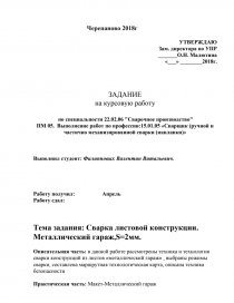 Описательная часть: в данной работе рассмотрены техника и технология сварки конструкций из листов «металлический гараж» , выбраны режимы сварки, составлена маршрутная технологическая карта, описана техника безопасности