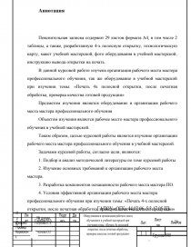 Пояснительная записка содержит 29 листов формата А4, в том числе 2 таблицы, а также, разработанную 4-х полосную открытку, технологическую карту, макет учебной мастерской, фото оборудования в учебной мастерской, инструкцию вывода открытки на печать.