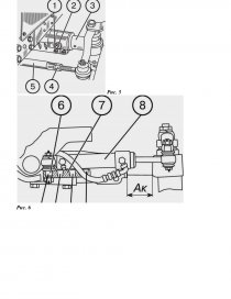 После изменения ширины колеи передних колес регулируют схождение путем изменения длины рулевой тяги (рис. 7-8). - Устанавливают требуемое давление в шинах. - На ровной площадке необходимо проехать на тракторе в прямом направлении не менее 3 м и остановится. Включить стояночный тормоз. - Проверяют, чтобы корпуса колесных редукторов (трактор МТЗ-82.1) или поворотные кулаки (МТЗ-80, МТЗ-82) были выдвинуты на одинаковую величину "Б" из корпуса ПВМ или трубы передней оси соответственно. - Замеряют расстояние "В" между двумя противоположными точками на закраине обода, сзади передней оси на высоте оси колес. - Перемещают трактор вперед так, чтобы передние колеса повернулись примерно на 180°, затем замеряют расстояние "А" спереди передней оси, между теми же точками, как и при измерении размера "В". Схождение правильное, если измерение "А" на 0-8 мм меньше измерения "В". Если схождение не соответствует этим значениям, проделывают следующее: - Отпускают гайки (1), (3) регулировочной трубы (2) рулевой тяги. - Вращая трубу, устанавливают требуемый размер схождения. - Затягивают гайки (1), (3) | ||||||