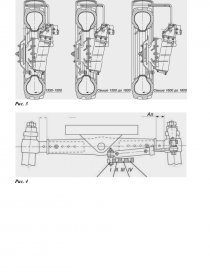 Колея передних колес на тракторе МТЗ-82.1 с гидрообъемным рулевым управлением регулируют ступенчато: выдвижением корпусов верхних конических пар с перестановкой цилиндра в отверстиях кронштейна и переворотом колес с перестановкой с борта на борт. При регулировке колеи выдвижением корпусов конических пар необходимо следить за тем, чтобы левый и правый корпуса были выдвинуты на одинаковую величину (рис. 5). Расстояние между отверстиями под установку пальца цилиндра в кронштейне равно 55 мм, что обеспечивает изменение колеи с интервалом 110 мм в сторону уменьшения или увеличения от среднего положения. После изменения колеи обязательно регулируют схождение передних колес и затягивают гайки крепления колес к ступицам моментом 200...250 Нм, гайки крепления дисков к кронштейнам обода моментом 180...240Нм. Установка колеи передних колес тракторов МТЗ-82.1, оборудованных ПВМ с планетарно-цилиндрическими редукторами конечных передач. Колея трактора по передним колесам регулируют в пределах 1420... 1970 мм за счет перестановки колес и изменения взаимного расположения дисков и ободьев колес. Для регулировки колеи тракторов МТЗ-82.1 с ПВМ выполняют следующие операции: - Затормаживают трактор стояночным тормозом. Кладут упоры спереди и сзади задних колес; - Поднимают домкратом переднюю часть трактора (или поочередно передние колеса), обеспечив просвет между колесами и грунтом; - Снимают передние колеса; - Отворачивают гайки крепления обода колеса к диску. В зависимости от требуемой колеи устанавливают соответствующее взаимное расположение обода и диска так, как показано на схеме. При этом необходимо обратить внимание на то, чтобы направление вращения колес совпадало с | ||||||