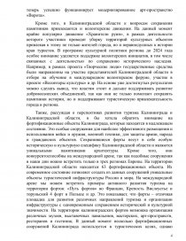 Калининград – самый западный областной центр России. Город расположен на берегу Балтийского моря в устье реки Преголи. Калининградская область отделена от России сухопутными границами других государств и международными морскими водами. Этот регион – российский островок в Европе. В прошлом Калининград носил название Кёнигсберг, являлся государственным центром Восточной Пруссии и важнейшим центром Балтики. Город обладает удивительно богатой историей и нехарактерным для России колоритом. Почти на любой улочке Калининграда можно встретить впечатляющие достопримечательности и памятники архитектуры. На данной территории располагаются исторические объекты разных эпох. Германские форты, прусские городища и другие достопримечательности являются уникальными составляющими истории и туристической инфраструктуры страны и региона. Именно поэтому культурно-познавательный туризм является одной из основополагающих траекторий развития.
