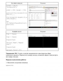 Упражнение №3. С помощью файла startup.m и test.m задать размеры графического окна и его положение на экране, которые будут использоваться при построении всех графических окон по умолчанию. Высота графического окна равна 350 точкам, а ширина 450 точкам. Графическое окно должно выводиться в центре экрана. С помощью команд, задаваемых в командной строке, создать два графических окна. Первому графическому окну присвоить имя fig1, второму – fig2. Сделать текущим окно fig1. В строке заголовка текущего графического окна вывести надпись – «Первое окно». Сделать текущим окно fig2. Изменить цвет фона текущего графического окна на черный.