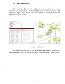 - Среди выделенных ранее объектов в слое Здания. выбрать объекты, лежащие внутри построенных буферных зон. Подсчитать количество таких зданий.