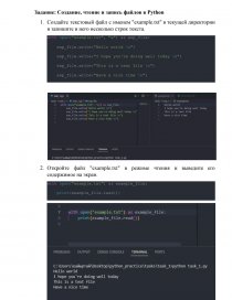 - Создайте текстовый файл с именем "example.txt" в текущей директории и запишите в него несколько строк текста.