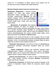 Идоракунии Windows. Дар Windows аксари бандҳоро ба воситаи муш иљро кардан мумкин аст. Элементи идоракунии муш дар экрани монитор нишондиёандаи он ( ) мебошад. Ҳаракати муш дар болои ҳамвори якҷоя бо ҳаракати нишондиёандааш дар экрани монитор ба амал меояд: аз ҷумла дар болои Мизи кори.[pic 2]