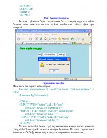 document.write (“<FONT COLOR=‘RED’>Қызыл түсті мәтін</FONT>”)