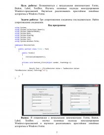 Цель работы: Познакомиться с визуальными компонентами: Forms, Button, Label, TextBox. Изучить основные подходы конструирования Windows-приложений. Научиться реализовывать простейшие линейные алгоритмы в Windows Forms.