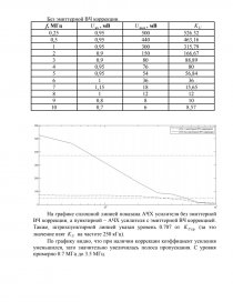 На графике сплошной линией показана АЧХ усилителя без эмиттерной ВЧ коррекции, а пунктирной – АЧХ усилителя с эмиттерной ВЧ коррекцией. Также, штрихпунктирной линией указан уровень 0.707 от (за это значение взят на частоте 250 кГц).[pic 9][pic 10]