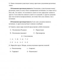1)Отношения противоположности. Отношения, существующие между различных типов, не могут быть одновременно истинными, но ложью могут быть оба. Это значит, что истинность одного из них определяет ложность другого. Если известна ложность одного из суждений, то другие суждения при этом остаётся неопределённым, оно может быть как ложным, так и истинным.