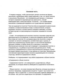 Слово - это материальный носитель понятия, языковое средство для фиксации мысли, ее хранения, а также для передачи другим людям. Вне слова нет понятия. В то же время единство понятия и слова не означает их полного совпадения, соответствия один к одному. В различных национальных языках одно и то же понятие выражено разными словами, в любом языке есть омонимы и синонимы. Многозначные значения слов часто приводят к смешиванию понятий, а следовательно, к ошибкам в мыслительной деятельности. Чтобы достигнуть определенности, ясности мыслительного процесса, логика исследует формы мышления с точки зрения их структуры. Важнейшими логическими характеристиками понятия, выражающими его сложную структуру, являются содержание и объем.
