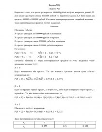 Вероятность того, что кредит размером до 1000000 рублей не будет возвращен, равна 0,25. Для кредита размером свыше 1000000 рублей эта вероятность равна 0,3. Банк выдал два кредита: 400000 и 5000000 рублей. Составить закон распределения случайной величины - числа невозвращенных кредитов из этих выданных.