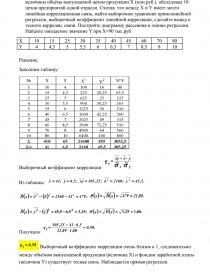 - Экономист, изучая зависимость выработки Y (тыс.руб.) на одного рабочего от величины объёма выпускаемой цехом продукции Х (млн.руб.), обследовал 10 цехов предприятий одной отрасли. Считая, что между Х и Y имеет место линейная корреляционная связь, найти выборочное уравнение прямолинейной регрессии, выборочный коэффициент линейной корреляции, сделайте вывод о тесноте корреляц. связи. Постройте диаграмму рассеяния и линию регрессии. Найдите ожидаемое значение Y при Х=90 тыс.руб.