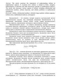 Abstract. The article examines the importance of understanding infinity in mathematical analysis. It examines how infinity is related to limits, integrals, differentiation of functions and other theoretical concepts of mathematical analysis. The article also discusses various aspects of infinity, including infinitesimal and infinitesimal numbers, infinite functions, and infinity problems in mathematical calculations.