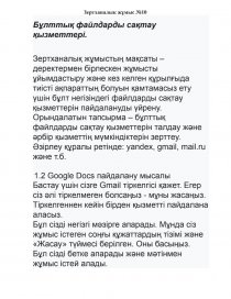 1. Зертханалық жұмыста қолданылатын пошталық қызметтердің (yandex; gmail; .mail.ru т.б.) қайсысында файлдарды сақтау қызметтері бар, олардың мүмкіндіктерін зерттеңіз.