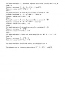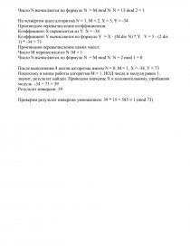 Теоретическая часть. Для вычисления обратных элементов в поле вычетов используется расширенный алгоритм Евклида. Известно, что если числа n и х являются взаимно простыми и х < n, то для х существует единственное значение х' — такое, что х'