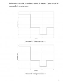 Для моделирования показаний акселерометра в этой модели были использованы блоки Step, которые представляют из себя ступенчатые воздействия. Просуммировав их, на графике мы получим функцию измеряемого ускорения. Полученные графики по осям x и y представлены на рисунках 2 и 3 соответственно.
