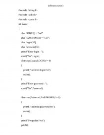 - Выводится логин в консоль и с помощью условия (if) сравниваются (strcmp) два логина. Если логин не правильно, то начинается заново с помощью функции main(). Если правильно, то переходится к следующему шагу.