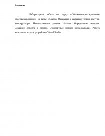 Лабораторная работа по курсу «Объектно-ориетированное программирование» на тему: «Классы. Открытые и закрытые уровни доступа. Конструкторы. Инициализация данных объекта. Определение методов. Создание объекта в памяти. Стандартные потоки ввода-вывода». Работа выполнена в среде разработки Visual Studio.