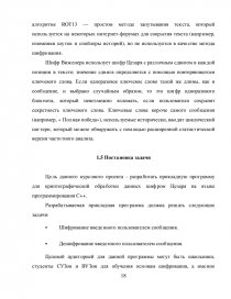 В рамках данного курсового проекта поставлена задача написать программу, которая позволяет зашифровывать и расшифровывать с помощью шифра Цезаря сообщение, написанное на русском языке. Этот шифр реализует следующее преобразование текста: каждая буква исходного текста заменяется третьей после нее буквой в алфавите, который считается написанным по кругу. Для решения задачи использован язык программирования C++.