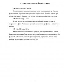 В модуле находится выделение памяти для массива структур. Главная функция main, её реализация, функция выбора в меню, функция выхода при изменении данных. Также в этом модуле находится реализация структуры.