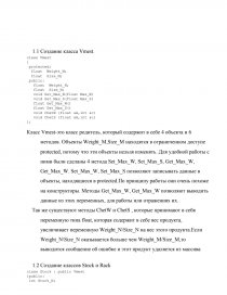 Класс Vmest-это класс родитель, который содержит в себе 4 объекта и 6 методов. Объекты Weight_M,Size_M находятся в ограниченном доступе protected, потому что эти объекты нельзя изменять. Для удобной работы с ними были сделаны 4 метода Set_Max_W, Set_Max_S, Get_Max_W, Get_Max_W. Set_Max_W, Set_Max_S позволяют записывать данные в объекты, находящиеся в protected.По принципу работы они очень похоже на конструкторы. Методы Get_Max_W, Get_Max_W позволяют выводить данные из этих переменных, для работы или отражениях их.