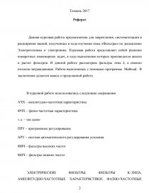 Данная курсовая работа предназначена для закрепления, систематизации и расширения знаний, полученных в ходе изучения темы «Фильтры» по дисциплине Электротехника и электроника. Курсовая работа представляет собой решение конкретных инженерных задач, в ходе выполнения которых производится анализ и расчет фильтров. В данной работе рассмотрим фильтры типа k, а именно полосно-заграждающие. Работа выполнялась с помощью программы Mathcad . В заключение делается вывод о проделанной работе.