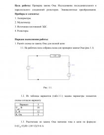 Цель работы: Проверка закона Ома. Исследование последовательного и параллельного соединений резисторов. Эквивалентные преобразования. Приборы и элементы: