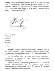 Решение: Рассмотрим равновесие прямоугольной однородной плиты, вес [pic 66] которой приложен в точке пересечения диагоналей прямоугольника. Отбросим связи, которыми являются опоры [pic 67], [pic 68] и невесомый стержень [pic 69], заменяя их действие реакциями .