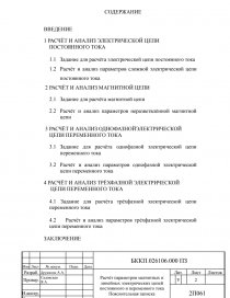 Учебная дисциплина "Теоретические основы электротехники" базируется на знании общеобразовательных дисциплин: математики, физики и является основой для изучения специальных дисциплин. В данной работе мы должны рассчитать магнитные и электрические цепи постоянного и переменного. Расчёт электрической цепи постоянного тока методом контурных токов основан на использовании только второго закона Кирхгофа. Схема делится на ячейки (независимые контуры). Для каждого контура вводится свой ток Ik, который является расчётной величиной. Метод узловых напряжений – это расчет электрических цепей, в которых переменными являются значения напряжений в узлах цепей относительно базисного узла. Уравнения составляются на базе первого закона Кирхгофа, что позволяет сократить число уравнений системы до значения k-1, где k - число узлов цепи. При расчете неразветвленных магнитных цепей в обратной задаче необходимо определить рабочий поток по известной МДС катушки или по заданному намагничивающему току. Известны геометрические размеры всех участков магнитной цепи, материалы, из которых они изготовлены, основные кривые намагничивания или петли гистерезиса и числа витков катушек. Целью расчета цепей синусоидального тока является определение напряжений, токов и мощностей (активных и реактивных) в ветвях электрической цепи. Во многих случаях требуется найти не только значения токов и напряжений, но и сдвиги фаз между ними. Для анализа и расчета цепей синусоидального тока наиболее удобен символический метод, основанный на использовании алгебры комплексных чисел.