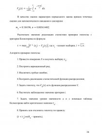 Ставится задача проведения первичного статистического анализа экспериментальных данных, а именно, построение вариационного ряда, исключение грубых ошибок измерений, построение статистических оценок параметров распределения (математического ожидания и дисперсии), построение интервального статистического ряда, построение статистических оценок функции и плотности распределения. Далее приводятся результаты проверки статистической гипотезы о нормальности закона распределения исследуемой случайной величины по критерию согласия Пирсона и Колмогорова.
